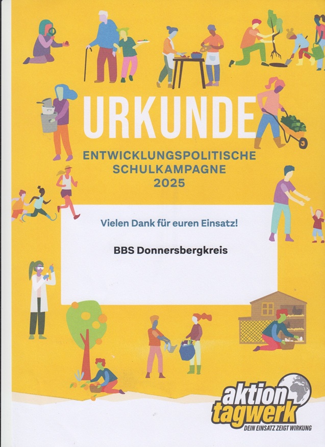 Für unsere erfolgreiche Teilnahme haben wir nun eine Urkunde als Anerkennung erhalten. Wir sind sehr stolz darauf und werden sie stellvertretend für jede einzelne Schülerin und jeden einzelnen Schüler, die sich in den vergangenen zehn Jahren bei der Aktion Tagwerk engagiert haben, aufhängen.