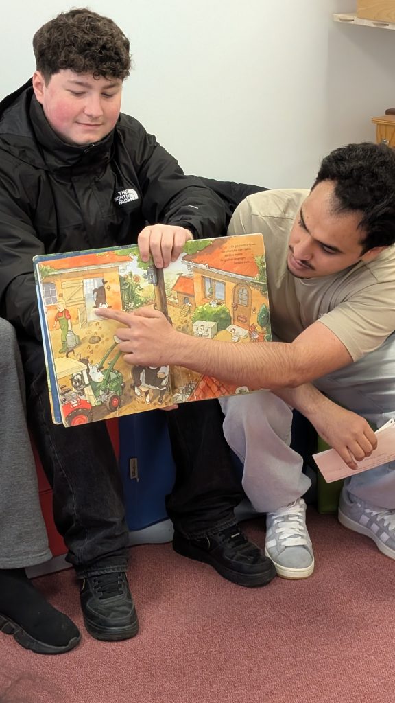 Im Rahmen der landesweiten Aktion „Tage des Lesens“, die in dieser Woche in ganz Rheinland-Pfalz für das Medium Buch wirbt, fand der Deutschunterricht des Berufsvorbereitungsjahres Holz heute im benachbarten Kindergarten „Bunte Welt“ statt.